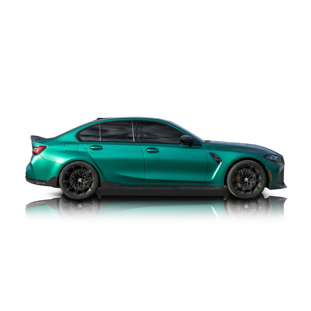 Wearing an Isle of Man Green Metallic coat of paint, the Matte Black PPF grants the car a suitably restrained yet eye-catching vibe. Of course, its M Shadowline lights with Icon Adaptive LED headlamps, BMW M 50 Year emblems and Carbon Fiber Trim Package add to its allure, as does its quartet of exhaust pipes, black wheels and generally fierce design. This is definitely not a regular 3-Series and it’s not afraid to shout it. The Yas Marina Blue interior of this 2023 BMW M3 Competition xDrive Sedan is well equipped as you’d expect from a luxury brand’s product. You have the Parking Assistant Package, M Drive Professional Package, front ventilated seats with power adjustment, wireless device charging, Apple CarPlay, Android Auto and front plus rear USB charging ports. Rear-seat occupants even get their own climate control zone!