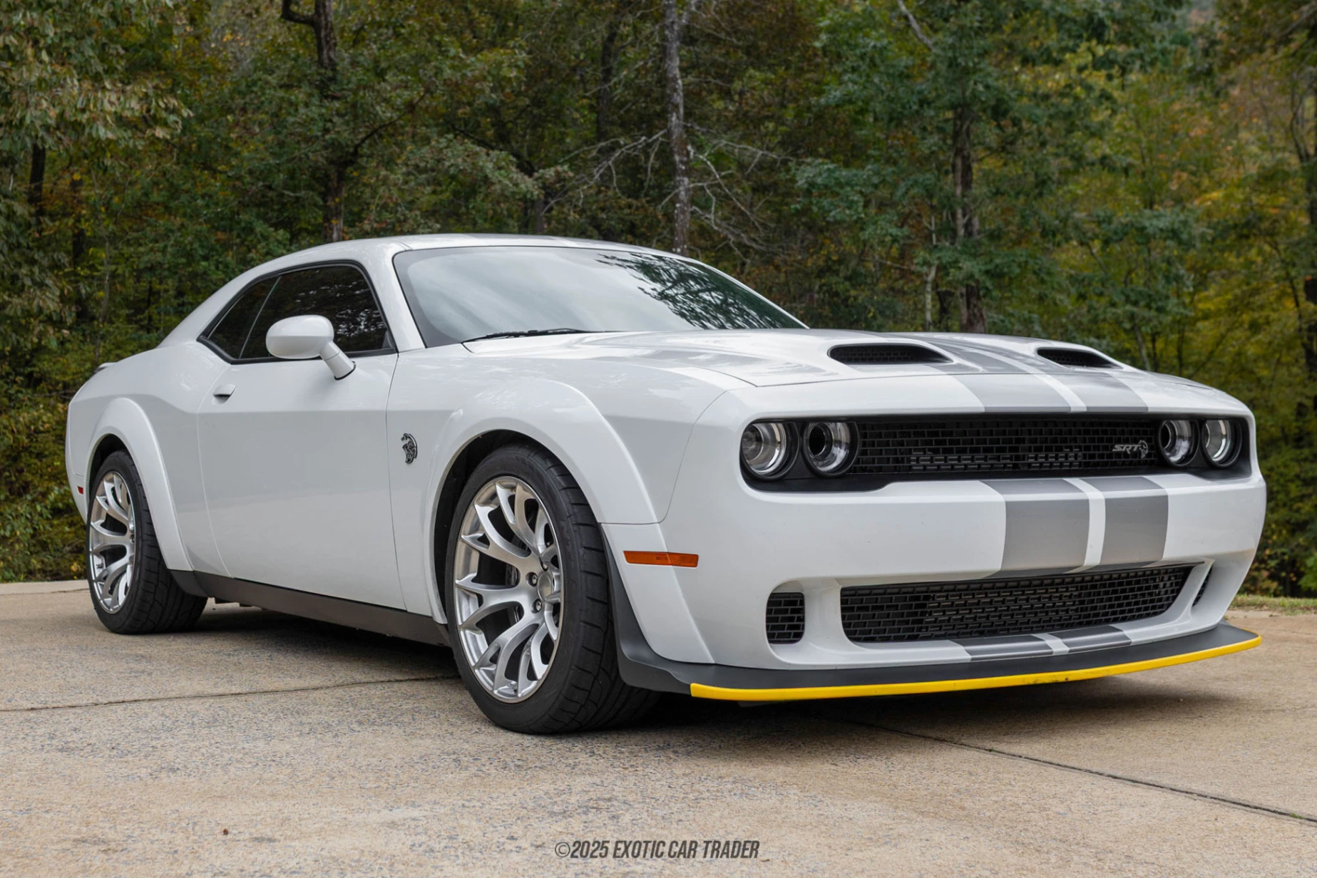 The exterior of this 2023 Dodge Challenger SRT Redeye Widebody Jailbreak is a combination of aggression and elegance, thanks to its White Knuckle exterior finish and signature dual silver stripes. The clean aesthetic of this car is complemented by Satin chrome exterior badges, a chrome fuel-filler door, and widebody fenders. It rolls on 20" x 11" Warp–Speed Satin Carbon wheels, housing Gunmetal Gray brake calipers, and enveloped in Nitto NT555 G2. The light color theme continues to the interior, with Hammerhead Gray Laguna leather seats embossed with the SRT Hellcat logo and complemented by Hammerhead Gray seat belts. Floor mat binding and a suede headliner are a few creature comforts. It also has a power sunroof to let plenty of natural light into the cabin. Subtle red hints can be noticed on the dash, including the tachometer, speedometer, and the Jailbreak moniker on the AC vent. The driver gets an SRT leather steering wheel with a white LED logo, offering a contemporary and sporty feel. Harman Kardon audio system with subwoofer gratifies your audiophile, while the Technology and Driver Convenience Groups add practicality to this muscle car.