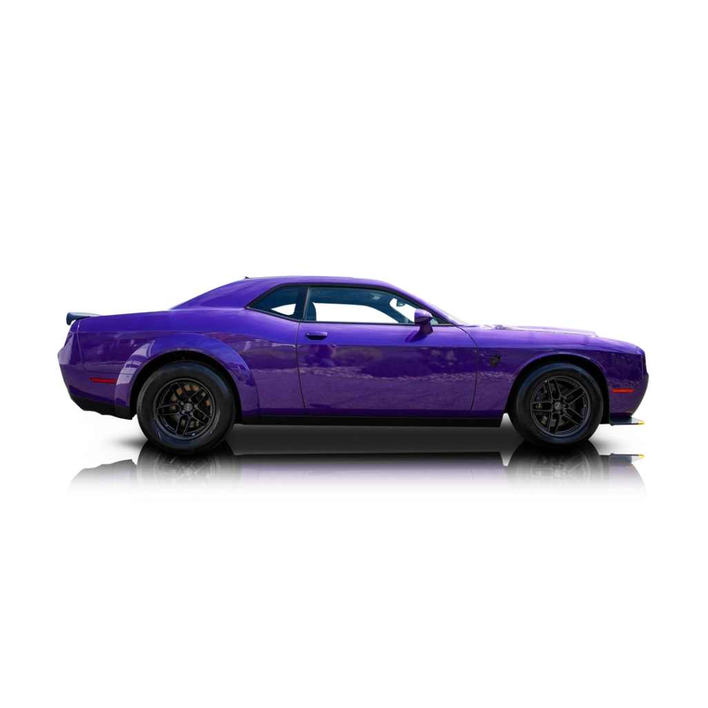 Finished in the instantly recognizable Plum Crazy Pearl, this Demon 170 is visually as bold as its name implies. Flared rear body panels, an Air-Grabber hood, SRT performance spoiler, forged aluminum wheels, and Brembo 4-piston brakes with yellow-painted logos give this Challenger a stance that’s all business. The details don’t stop at the bodywork, either. There are black brake calipers, a satin black “Dodge” tail lamp badge, and subtle yet aggressive accents that push the styling into proper modern muscle territory. Inside, the cabin is equally dramatic. 170-spec Alcantara leather seats, Demonic Red seat belts, and real carbon fiber trim elevate the environment well beyond standard fare. A suede headliner and door inserts, leather-wrapped shift knob, and the SRT Alcantara steering wheel with red LED logo create a performance-focused cockpit. Meanwhile, the Premium Group ensures comfort is never sacrificed, with heated and ventilated seats, a Harman Kardon 18-speaker sound system, trunk-mounted subwoofer, and power sunroof all on board.