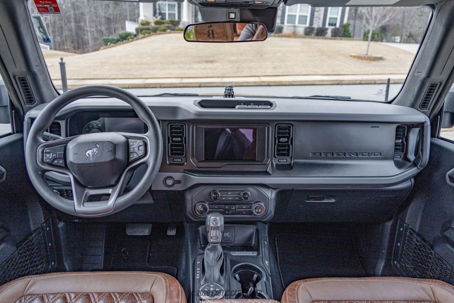 The exterior of this 2023 Ford Bronco is Shadow Black, originally fitted with 17” silver-painted steel wheels and 32” all-terrain tires before receiving a 5” lift kit, 22x14 bronze wheels and Fortune 37x13 tires for a much taller, wider stance. A Bronco Mojave color-matched hood, front bumper with XRC9500 winch, rear full bumper with integrated sensors, power Eboards and multiple auxiliary LED lights on the roof, bumper and fog locations give it a purposeful off-road look and improved trail visibility. The interior of this 2023 Ford Bronco was originally cloth gray/black but now features two-tone custom leather seats in dark brown w/ tan stitching and embroidered “B” logos on the headrests. This upgrade brings a more upscale feel while keeping the factory Bronco layout and tech, making the cabin feel unique without sacrificing practicality.
