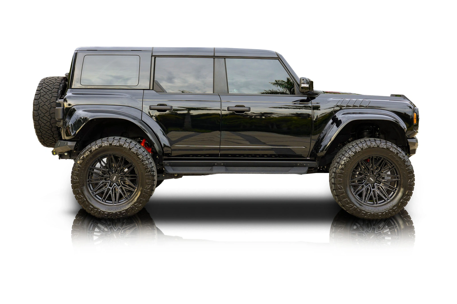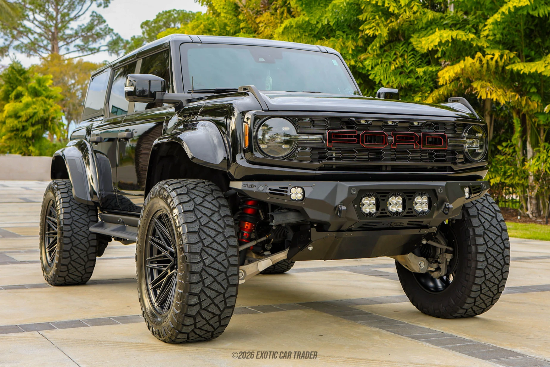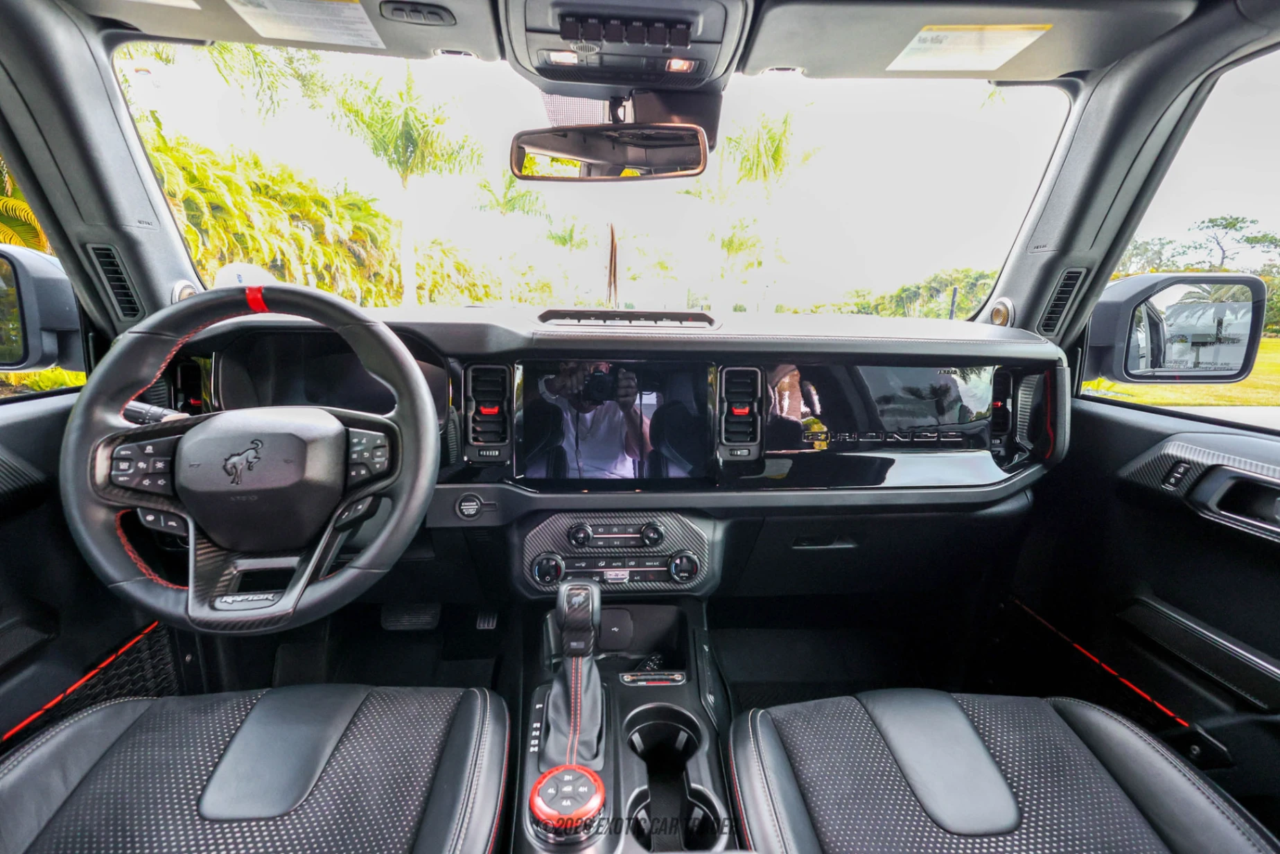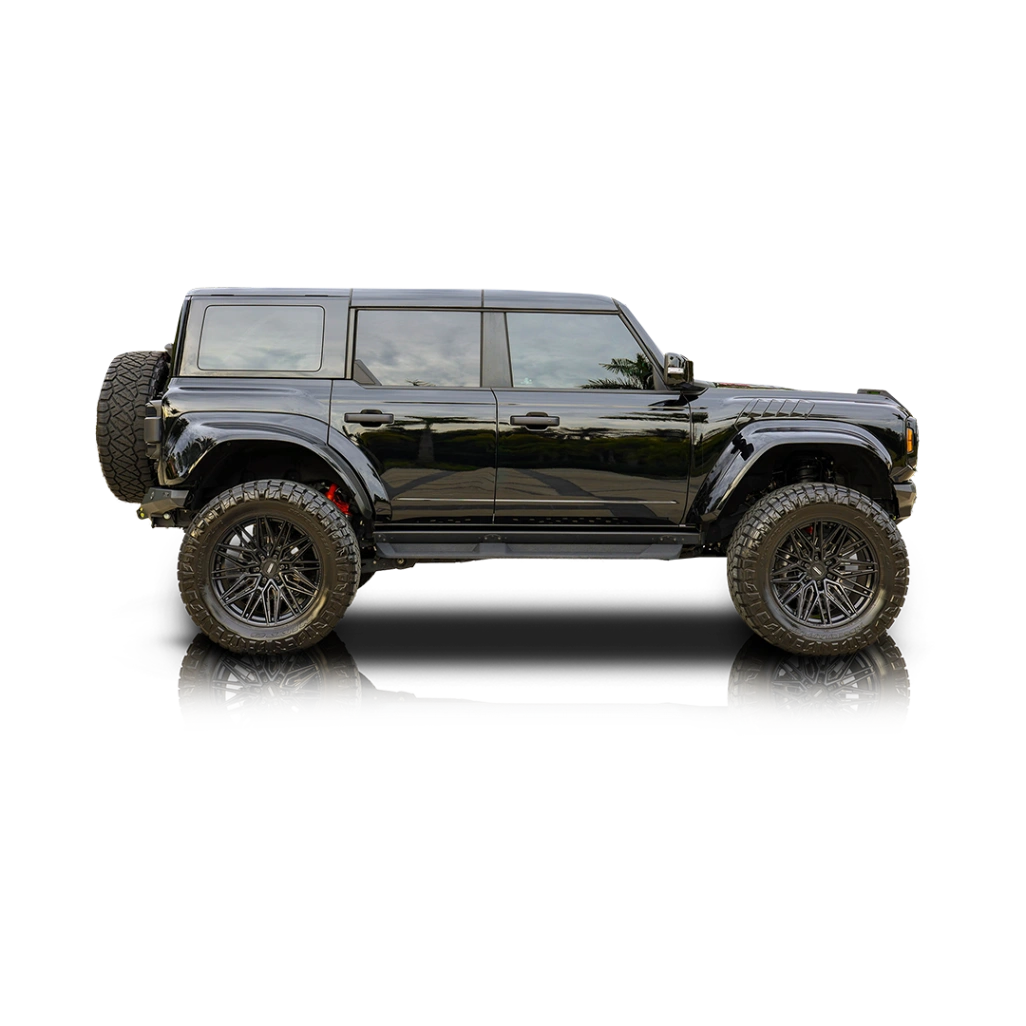 Finished in Shadow Black, the exterior of this Bronco Raptor presents an aggressive, purposeful appearance reinforced by the Gray Molded-In hard top, sound-deadening headliner, and on-vehicle storage bags for the roof and doors, enhancing both versatility and comfort. The stance is further transformed by a 3-inch suspension lift and 22-inch Vossen wheels wrapped in 38-inch Nitto Ridge Grappler tires, giving the Bronco a commanding presence while maintaining off-road credibility. Inside, the Onyx interior is upgraded with leather-trimmed seats featuring suede inserts and the Interior Carbon Fiber Pack, creating a performance-oriented yet upscale environment. Additional touches such as the keyless entry keypad and embroidered custom flooring reflect a focus on convenience and personalization. Audio performance is significantly enhanced through a custom audio system paired with a 12-inch Alpine subwoofer housed in a custom enclosure, delivering a premium listening experience well beyond factory offerings.