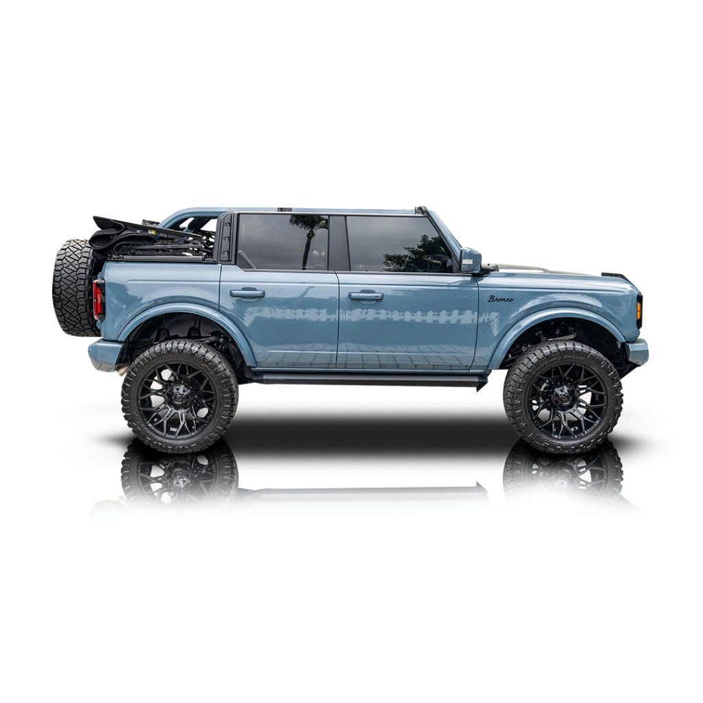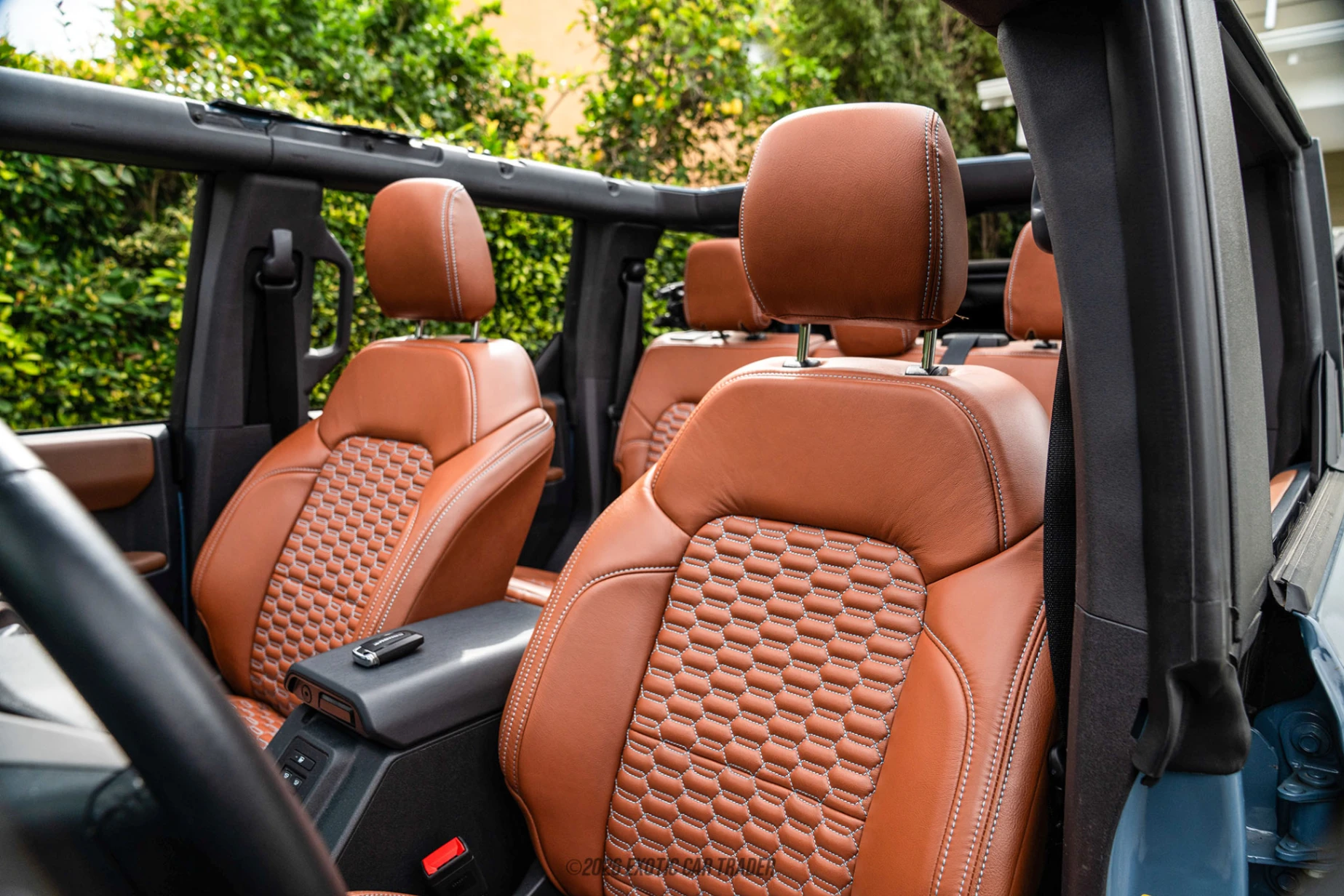 A few ways to easily set the Outer Banks apart from the rest of its competitors are its standard body-color painted fender flares, powder-coated tube steps, and signature LED headlamps and taillamps. This distinctive exterior of our subject 2023 Ford Bronco Outer Banks wears a lovely Azure Gray paint. It wears aftermarket 35" wheels by Fuel in matt black and Nitto Ridge Grappler tires that ensure you get optimum grip when you are off-roading. The spare tire is imposingly mounted at the back, where it is accompanied by the Bronco logo. The AMP research power steps guide you into the cabin. The Outer Banks is filled with creature comforts, including heated front seats, a Bang & Olufsen 10-speaker sound system, and a 12-inch infotainment screen. Our subject Bronco features a custom Camel design theme. Despite its premium features, it is off-road ready with a Terrain Management System with Broncos G.O.A.T. Modes. The rear soft top can be lowered for an open-air feel.