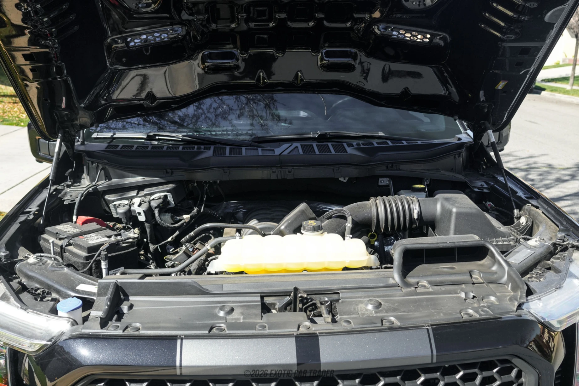 Under the hood of this 2023 Ford F-150 Shelby Super Snake is Ford’s proven 5.0-liter naturally aspirated Coyote V8, paired with electronic fuel injection and a 10-speed automatic transmission. Shelby enhances the driving experience with a Shelby-tuned Borla performance exhaust system with polished stainless dual tips, giving the truck a deeper and more aggressive sound. The truck also benefits from Shelby’s engineered suspension system featuring Ridetech components and FOX adjustable shocks, including front coilovers and upgraded rear shocks. Supporting hardware such as replacement upper control arms, rear traction bars, and a performance rear sway bar help improve stability and traction while maintaining everyday drivability, making this Super Snake far more capable than a standard F-150 both on the road and under spirited driving.