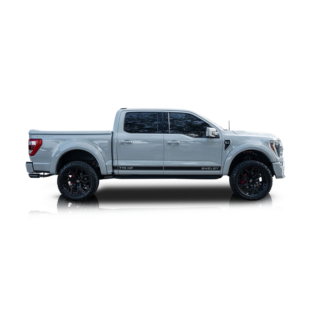 Under the hood lies a supercharged 5.0L V8, producing an impressive 775 horsepower thanks to Shelby’s performance upgrades. This engine delivers immediate throttle response and immense torque, making acceleration feel effortless despite the truck’s size. Power is routed through a 10-speed automatic transmission to all four wheels, providing confidence in a wide range of driving conditions. Shelby’s upgraded suspension system, including FOX internal bypass shocks and reinforced components, enhances both on-road handling and off-road capability. Paired with a Borla exhaust system and performance intake, this truck delivers not only exceptional performance but also a deep, aggressive exhaust note to match.