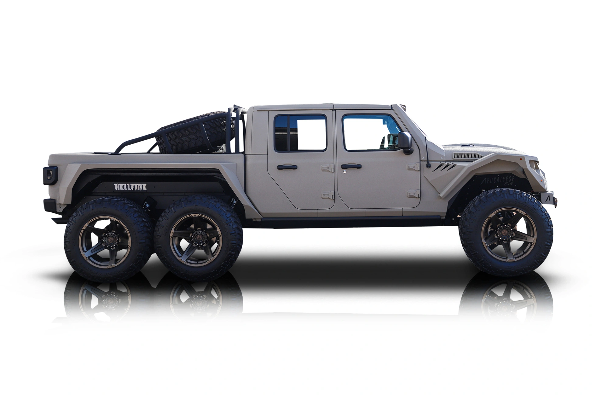Visually, the Apocalypse Hellfire 6×6 is defined by its widened stance and extended bed, achieved through custom sheet metal fabrication and the integration of Apocalypse-specific front and rear fender systems. The exterior is further distinguished by a Grumper-style front bumper, rear bumper with hitch, power side steps, LED halo headlights, and a SoFlo Mojave hood with a glass insert, all of which contribute to a cohesive, aggressive appearance. Inside, the cabin departs from the Gladiator’s utilitarian roots through a custom leather interior finished in tan with black accents. The leather-wrapped dash and door panels elevate the interior presentation while maintaining factory ergonomics, and a custom shifter knob provides a subtle but intentional bespoke touch.