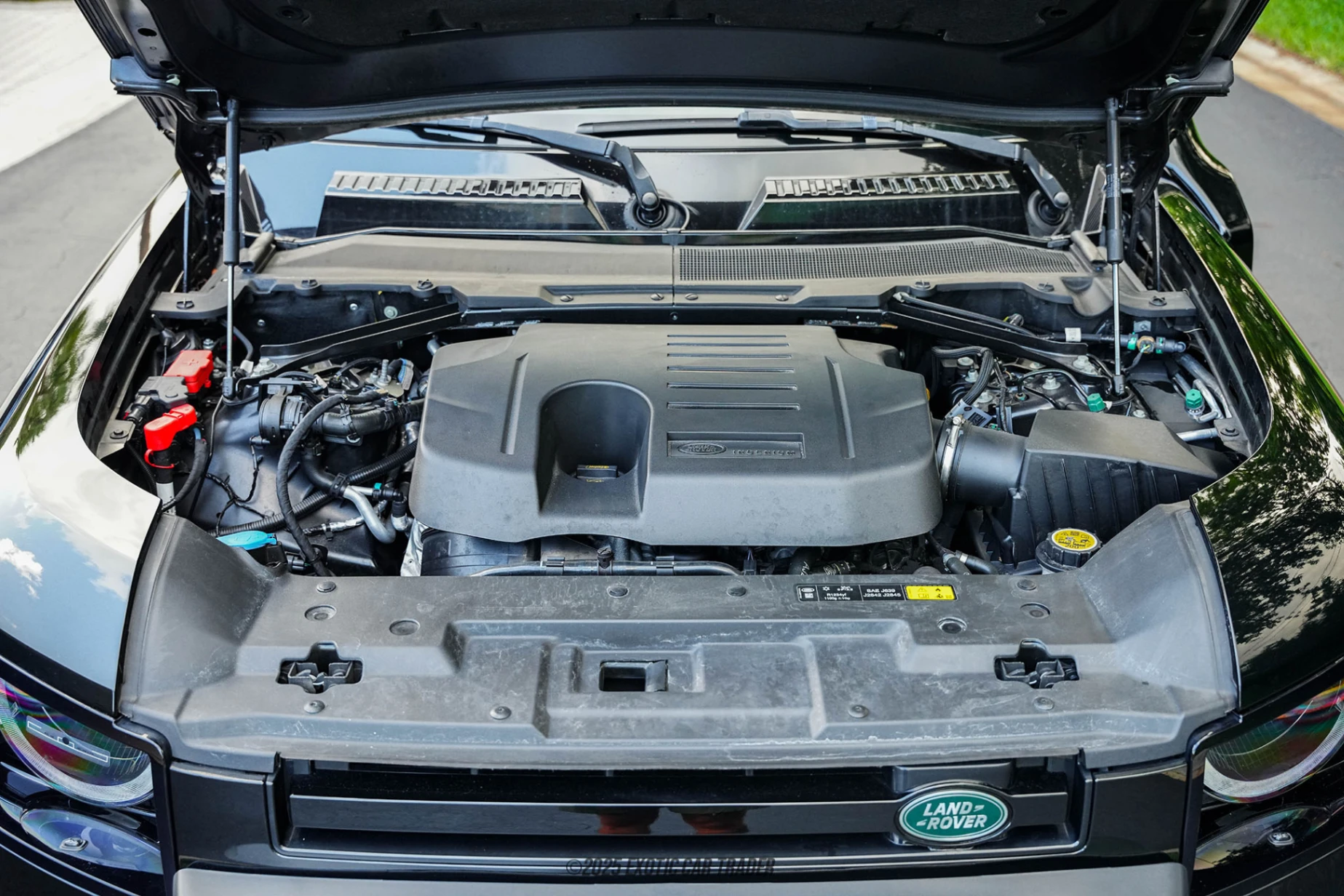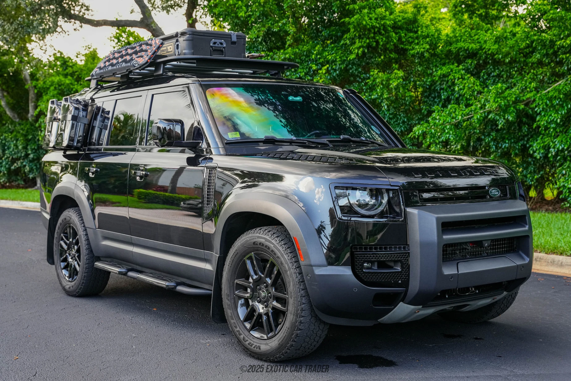 This 2023 Land Rover Defender 130 SE comes in a Santorini Black paint coat, and rides upon a quartet of black six-double-spoke alloy wheels with Land Rover center caps. The wheels are just 19 inches in diameter, but host Goodyear Wrangler all-terrain tires, showcasing that unlike most SUVs of today, the Defender chooses capability over cosmetics. Further exterior elements that we mustn’t miss include the gloss black raised air intake which is another functional bit, the roof rack-mounted Hi-Lift jack, the roof-mounted recovery boards, the Union Jack-stamped side steps, and of course, the Trophy Edition roof-mounted pelican cargo case. You’ll also see two five-gallon side-mounted fuel cans for that extra bit of endurance when you’ve wondered quite far into the wilderness without checking your fuel levels. The interior of this 2023 Land Rover Defender 130 SE features Ebony leather seating for up to five fully-grown adults, plus a spacious cargo compartment directly behind the rear seat. As a modern Land Rover product, it’s got features such as Apple CarPlay, Android Auto, a digital gauge cluster, four-zone climate control with rear air vents, powered and heated front seats, a wireless phone charger, and the usual convenience features one would expect from a luxury SUV. There’s even a panoramic sunroof for sunlight and fresh air.