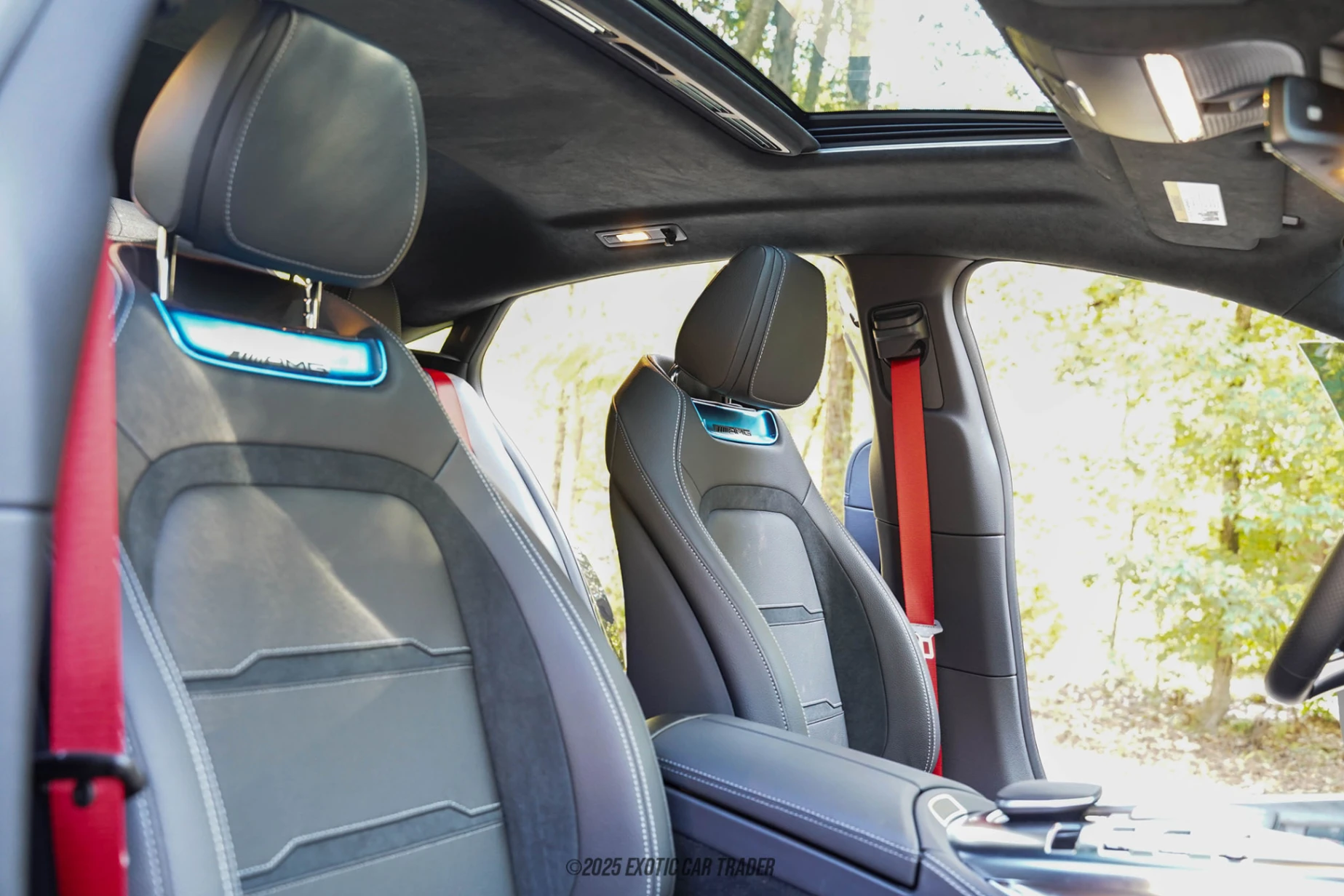 Finished in Graphite Grey Metallic, this GT 53 makes a bold visual statement, amplified by the AMG Night Package and Extended Night Package, which add darkened exterior elements for a stealthy presence. It rides on 20-inch AMG Black wheels (9.5” front, 11” rear) that emphasize its aggressive stance. Inside, the cabin features Black MB-Tex/Microfiber upholstery with Natural Grain Grey Ash Wood trim, a Manufaktur Black Microfiber headliner, and striking Red seatbelts, balancing luxury refinement with sporty character. Comfort and convenience are ensured by 3-zone climate control and a manual rear window sunshade, while the Head-Up Display with AMG-specific content and AMG Light Display reinforce the performance focus.
