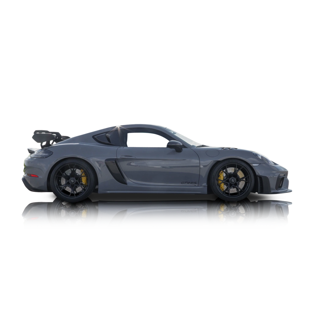 Stepping inside, it's business as usual with Porsche. Everything is well put together and of the highest quality. The Black Leather/Race-Tex seats with Arctic Grey stitching are ready to hold you in place, no matter how tight the corner. Despite being a stripped-out monster, they haven’t skimped on the little luxuries we take for granted in a modern high-end car. Namely, dual zone climate control, an intuitive infotainment system, and cruise control. The Cayman is beautifully proportioned. Finished in the stunning color of Arctic Grey, the highly sought-after Weissach Package is showcased in all its glory, with the Carbon hood adding contrast. And don’t worry about the low ride height, the optional front axle lift system will make it easy to clear those steep driveways.