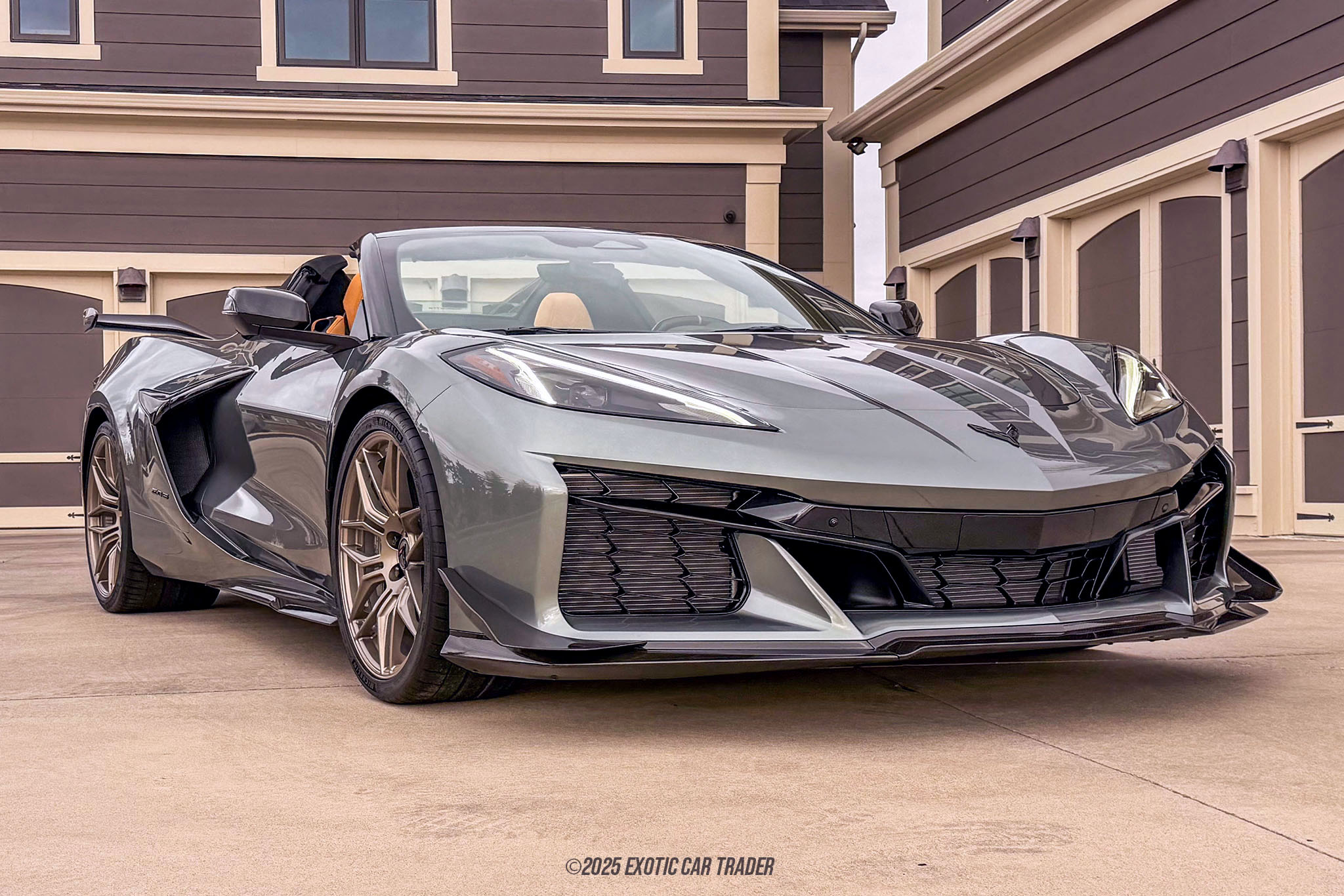 This 2024 Chevrolet Corvette Z06 Premium 3LZ comes in gray but its towering rear spoiler and menacing front end will be the show stealers. Then, it will roll on either gold or black wheels depending on which set you’ve got installed at the time – yes you get two sets with the sale of this car, replete with Cup or Summer tires. You can see the gold wheels installed in our photos. the interior of this 2024 Chevrolet Corvette Z06 Premium 3LZ features a two-tone tan and black theme. It’s a two-seat cabin with a host of amenities. The car has a digital gauge cluster, Apple CarPlay, Android Auto, dual-zone automatic climate control, heated and ventilated seats with power adjustment, a Bose speaker system, and all the other little niceties you’d expect in a luxury car today. Oh, and its multifunction steering wheel also includes gear shift paddles plus the controls for the car’s cruise control and infotainment systems.