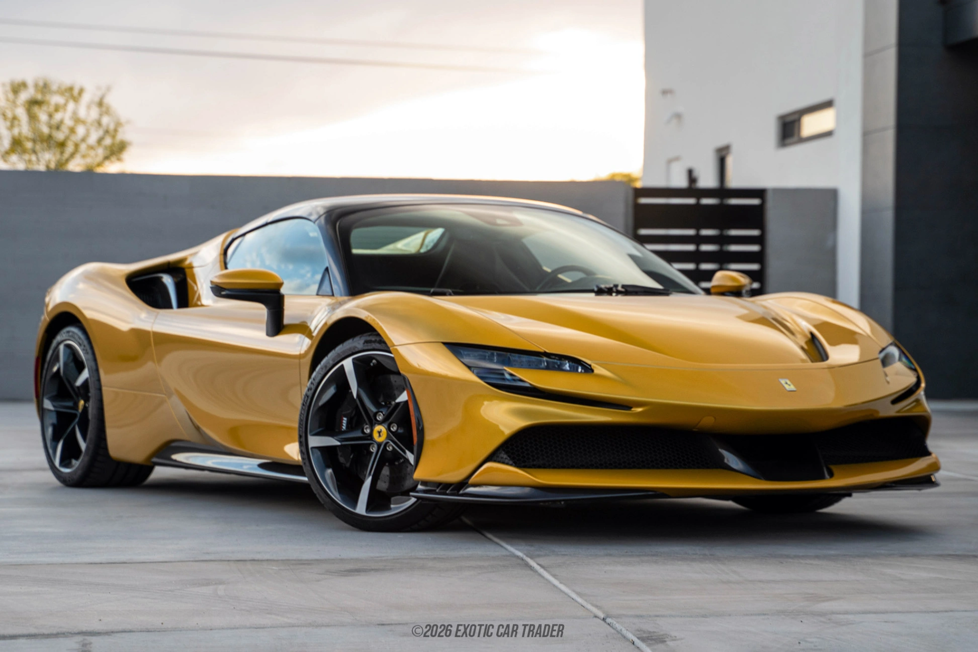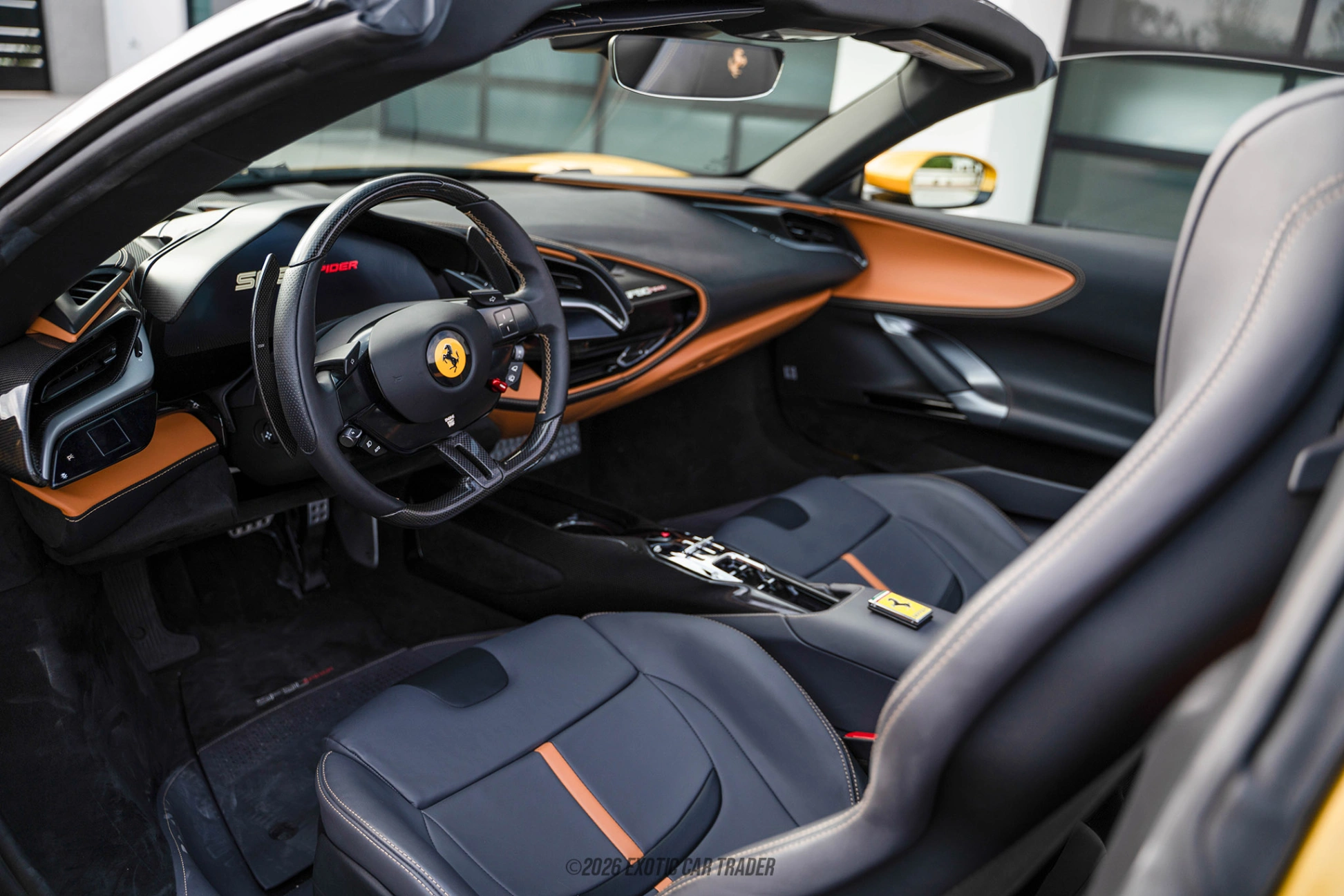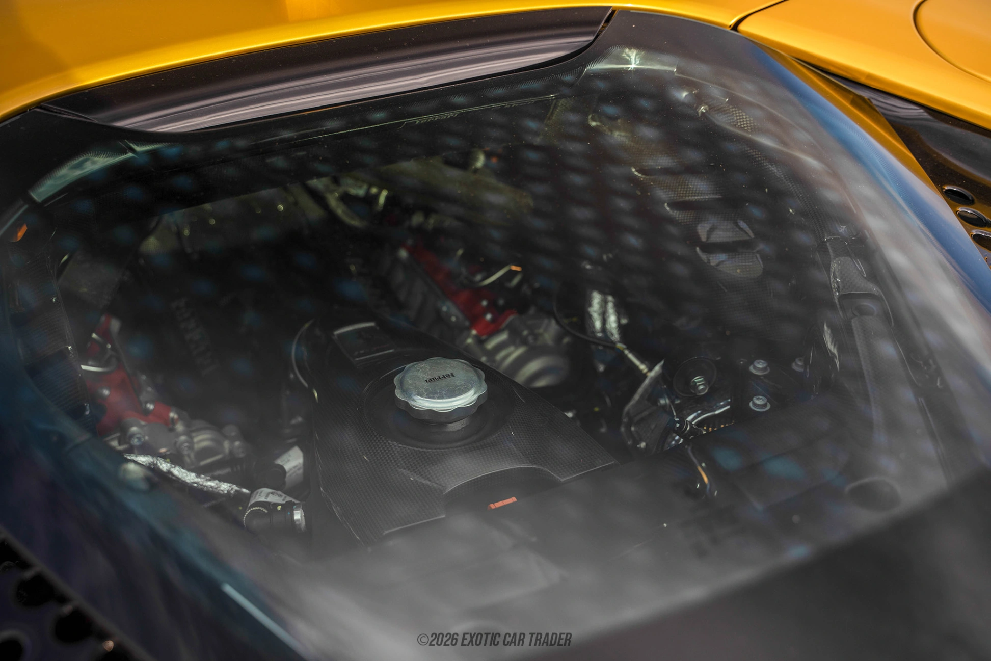 The exterior of this 2024 Ferrari SF90 Spider is finished in Giallo Montecarlo, a vibrant and historically rich Ferrari color that highlights the car’s aggressive and futuristic design. This example is heavily enhanced with exposed carbon fiber elements, including the side air splitters, rear diffuser, underdoor covers, and engine bay trim, all of which contribute to both aerodynamic efficiency and visual drama. The black brake calipers provide a subtle contrast against the bright bodywork, while the suspension lifter ensures practicality when navigating inclines or urban environments. Every angle of the car reflects Ferrari’s commitment to blending form and function, resulting in a machine that looks just as fast standing still as it does in motion. The interior of this 2024 Ferrari SF90 Spider is a purposeful yet luxurious cockpit finished in Nero leather with Arancio accents, creating a bold contrast that complements the exterior perfectly. The seats feature Arancio center stripes and matching stitching, while the embroidered Cavallino adds a signature Ferrari touch. Extensive use of carbon fiber throughout the cabin—including the driver zone with integrated LEDs, dashboard inserts, and upper tunnel trim—creates a distinctly motorsport-inspired atmosphere. Additional details such as leather/Alcantara carpets and coloured inner accents further elevate the sense of customization. The result is a cabin that feels both high-tech and handcrafted, designed to immerse the driver in a focused yet refined driving experience.
