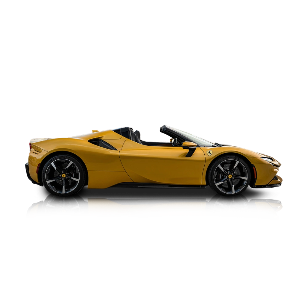 At the core of this SF90 Spider is a 4.0L twin-turbocharged V8 paired with three electric motors, producing a combined output of approximately 986 horsepower and delivering performance that rivals the world’s most elite hypercars. The advanced hybrid system enables instantaneous torque delivery, while the front electric axle provides true eAWD capability for exceptional grip and stability. Power is routed through an 8-speed dual-clutch transmission that offers rapid, seamless shifts, ensuring that the car responds instantly to driver inputs. The 7.9 kWh battery allows for short-distance electric driving, adding versatility to its performance credentials, while systems like Ferrari’s AFS enhance handling precision across varying conditions. Altogether, this setup creates a driving experience that is both brutally fast and technologically sophisticated, seamlessly blending electrification with Ferrari’s signature performance DNA.