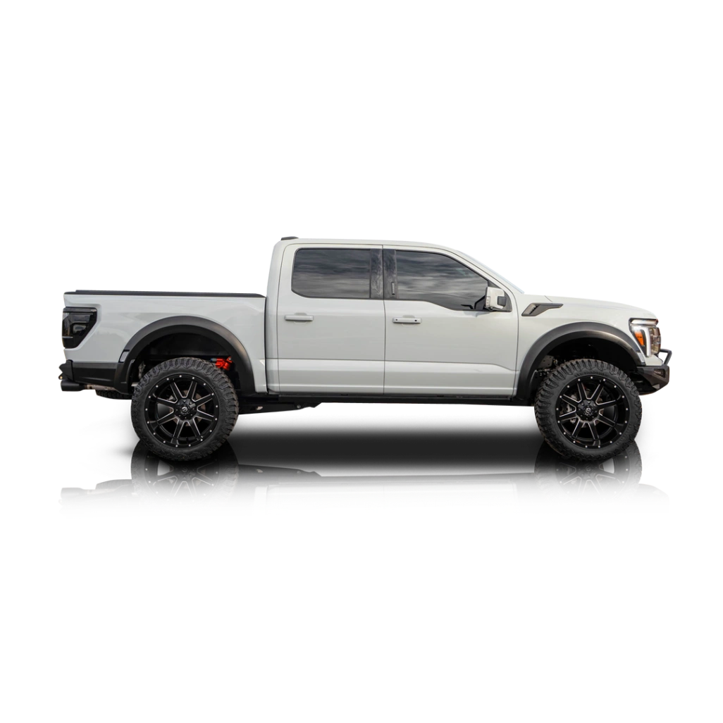 Draped in a color called Avalanche, this 2024 Ford F-150 Raptor 4x4 Supercrew is of the largest four-door crew cab variant. That means it not only sits taller than usual thanks to its lift kit, but also stretches 232 inches in length! The vehicle’s 24-inch Fuel wheels are dressed in 37-inch tires that are as purposeful as they look – after all, the right set of tires can take you far further off-road than all the power and electronics in the world. Moving on, we’ve got a Toughbed spray-in bed liner, a Graphics Delete, and a limo tint plus ceramic coating. The taillights are blacked-out, and the cargo bed is kept secure by a Retrax MB bed cover. Accessing the passenger cabin of this 2024 Ford F-150 Raptor 4x4 Supercrew is also made easy by AMP power running boards. The interior of this 2024 Ford F-150 Raptor 4x4 Supercrew comes in black, with Recaro front seats and a three-adult rear bench. Since it’s a Supercrew variant, there’s enough space in both rows. Key interior highlights include a twin-panel moonroof, Apple CarPlay, Android Auto, automatic climate control and USB charging ports.