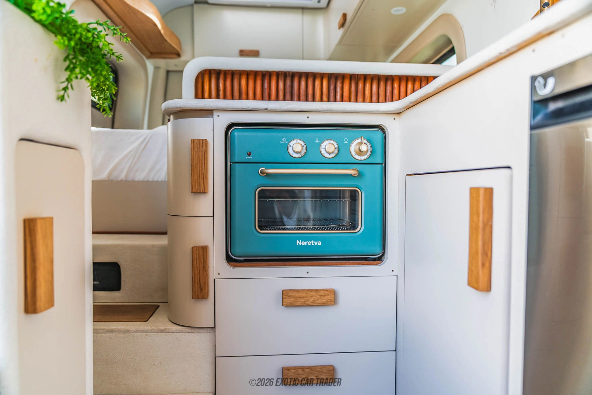 The exterior of this 2024 Mercedes-Benz Sprinter Rogue Luna is engineered for both rugged exploration and functional design. Equipped with a custom Rogue roof rack featuring integrated auxiliary lighting, it’s ready for off-grid adventures day or night. The addition of BFGoodrich KO3 all-terrain tires mounted on Black Rhino wheels, along with a Van Compass suspension system, enhances its off-road capability and stance. Practical upgrades such as the Owl Vans rear tire carrier, Aluminess rear storage box with bike carrier, Vanspeed side steps, and Flatline side ladder make this van highly versatile for carrying gear and accessing remote locations. The integration of Starlink ensures connectivity even in the most remote environments. The interior of this 2024 Mercedes-Benz Sprinter Rogue Luna is a fully realized living space, blending functionality with refined design. The cabin features custom cabinetry and a thoughtfully designed layout that includes a kitchenette with an oven, stovetop, and sink, along with a refrigerator/freezer for extended trips. A full wet bath with shower adds a level of comfort rarely found in off-grid vehicles. Climate control is handled by a 48V Cruise N Comfort air conditioning system and an AquaHot hydronic heating system, ensuring year-round usability. With a 37-gallon fresh water tank and 22-gallon gray water system, the van is equipped for extended stays without needing hookups.