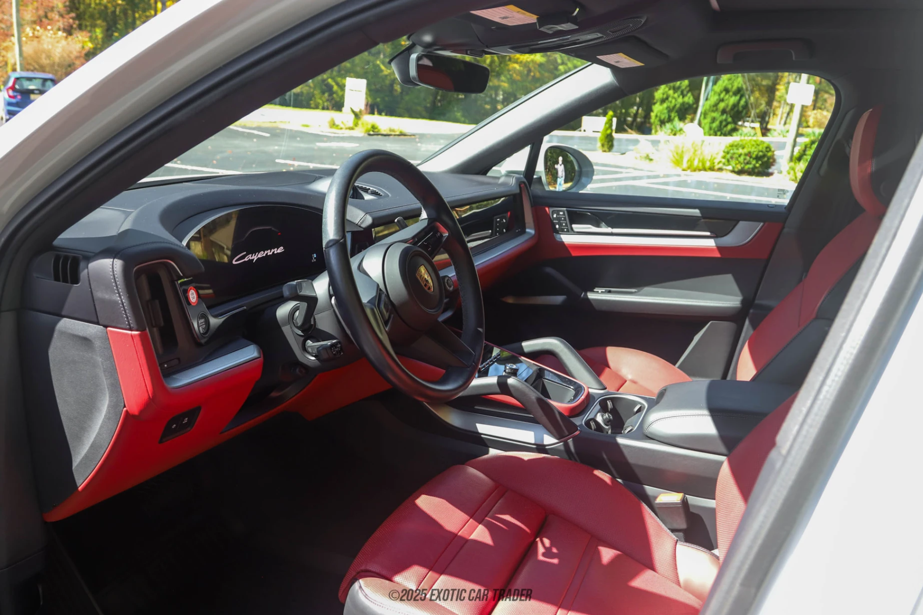 Did you know that the third generation Cayenne is actually available in two body styles? There’s the regular Cayenne, and the sportier Cayenne Coupe. The latter is differentiated by a more aerodynamic shape, slimmer A-pillars, a shallower windshield angle and new rear door panels. That’s what this 2024 Porsche Cayenne Coupe is, and it wears a Chalk paint job, protected at the front by an XPEL paint protection film. The model designation deletion option has been ticked for a cleaner rear profile, and Exclusive Design taillamps have been added. Meanwhile, the Chromite Black 22-inch Exclusive Design sport wheels really add a sense of agility and visual drama to this already sporty SUV. The interior of this 2024 Porsche Cayenne Coupe features a black and Bordeaux Red two-tone theme. Heated and powered seats, four-zone climate control, a heated steering wheel, Appl CarPlay, Android Auto, a premium sound system and a digital gauge cluster are all included. You’ve also got Silvershade interior accents, adaptive cruise control and a host of safety systems. And despite the sportier, sloping coupe-like silhouette, there’s still an acceptable amount of cargo space.