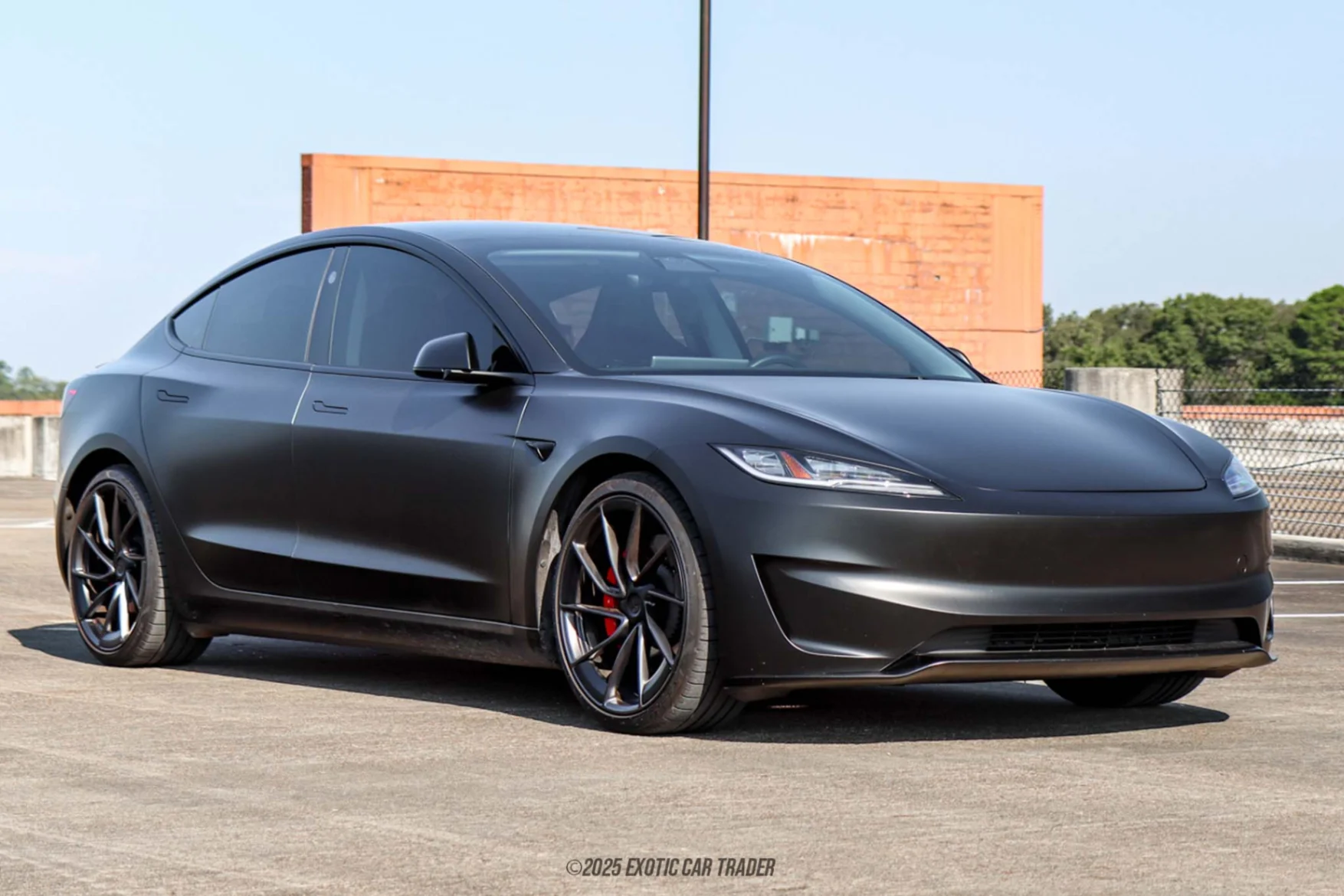 Visually, the matte black wrap sets a dramatic tone, turning the Model 3’s smooth design language into something stealthy and aggressive. Underneath lies a Gray factory finish, which pairs elegantly with the red brake calipers and 20-inch Zero-G Performance wheels. The black leather interior follows Tesla’s familiar minimalism, enhanced by modern convenience touches like a wireless charging pad and expansive sunroof. As with all Model 3s, the cabin remains clean and tech-forward, dominated by a single central touchscreen that controls nearly every function.