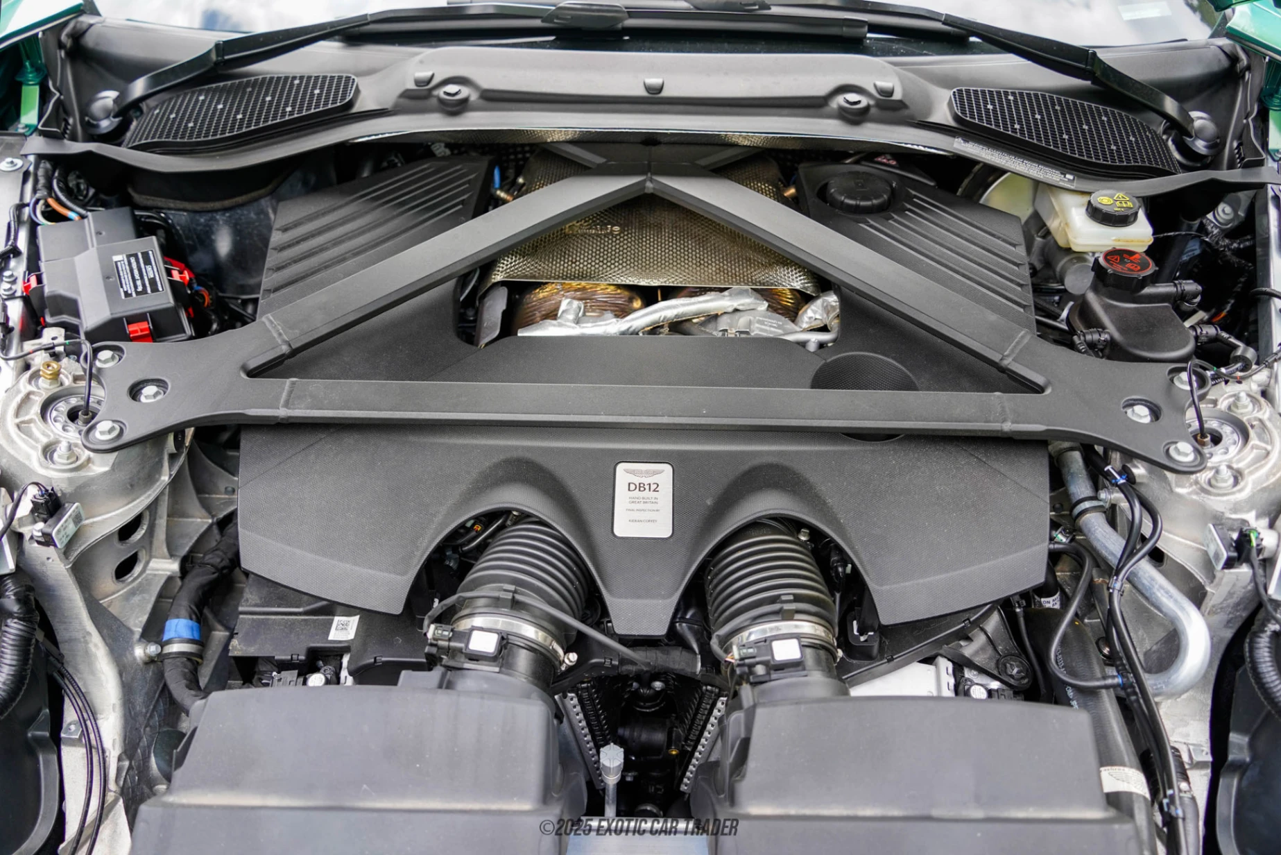 This 2025 Aston Martin DB12 wears a special Iridiscent Emerald coat of paint which is a shade that you’ll be hard-pressed to find anywhere else. It’s truly an eye-catching hue that will definitely turn heads, if the growl of the car’s V8 isn’t enough. The car’s got 21-inch Y-spoke alloy wheels in bronze, with bronze-painted brake calipers as well for some color contrast. It also comes with smoked taillamps and a carbon fiber roof panel. The sumptuously-appointed interior of this 2025 Aston Martin DB12 Coupe is pure luxury to be enjoyed. Able to accommodate two adults and two children, it’s got a host of features. These include a Bowers & Wilkins premium sound system, a 360-degree camera system with 3D surround-view, a heated steering wheel, powered, ventilated and heated front seats, contrast stitching, automatic climate control with air conditioning, and a full infotainment suite. A digital gauge cluster is also standard, while a spacious boot ensures that you don’t need to pack light.