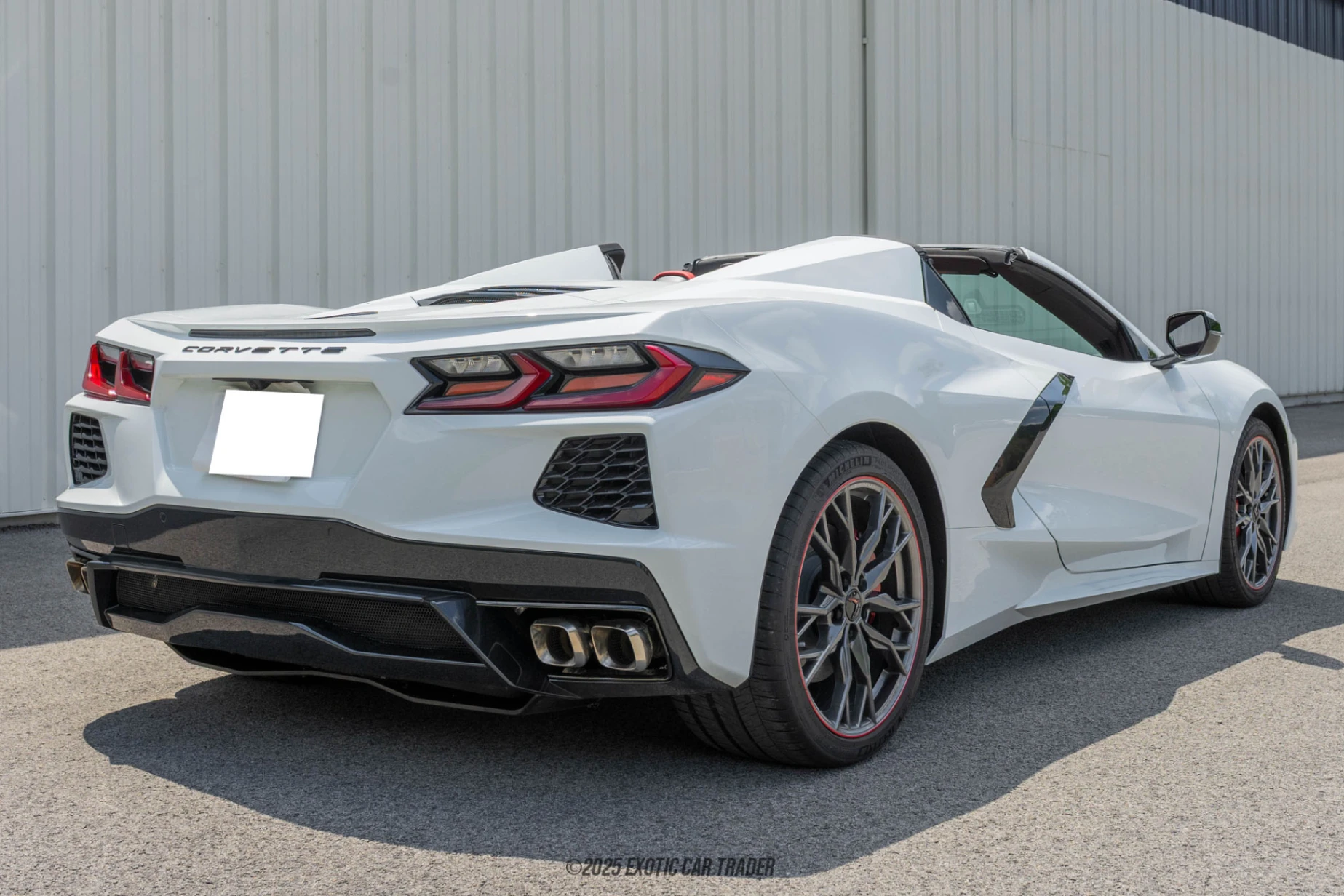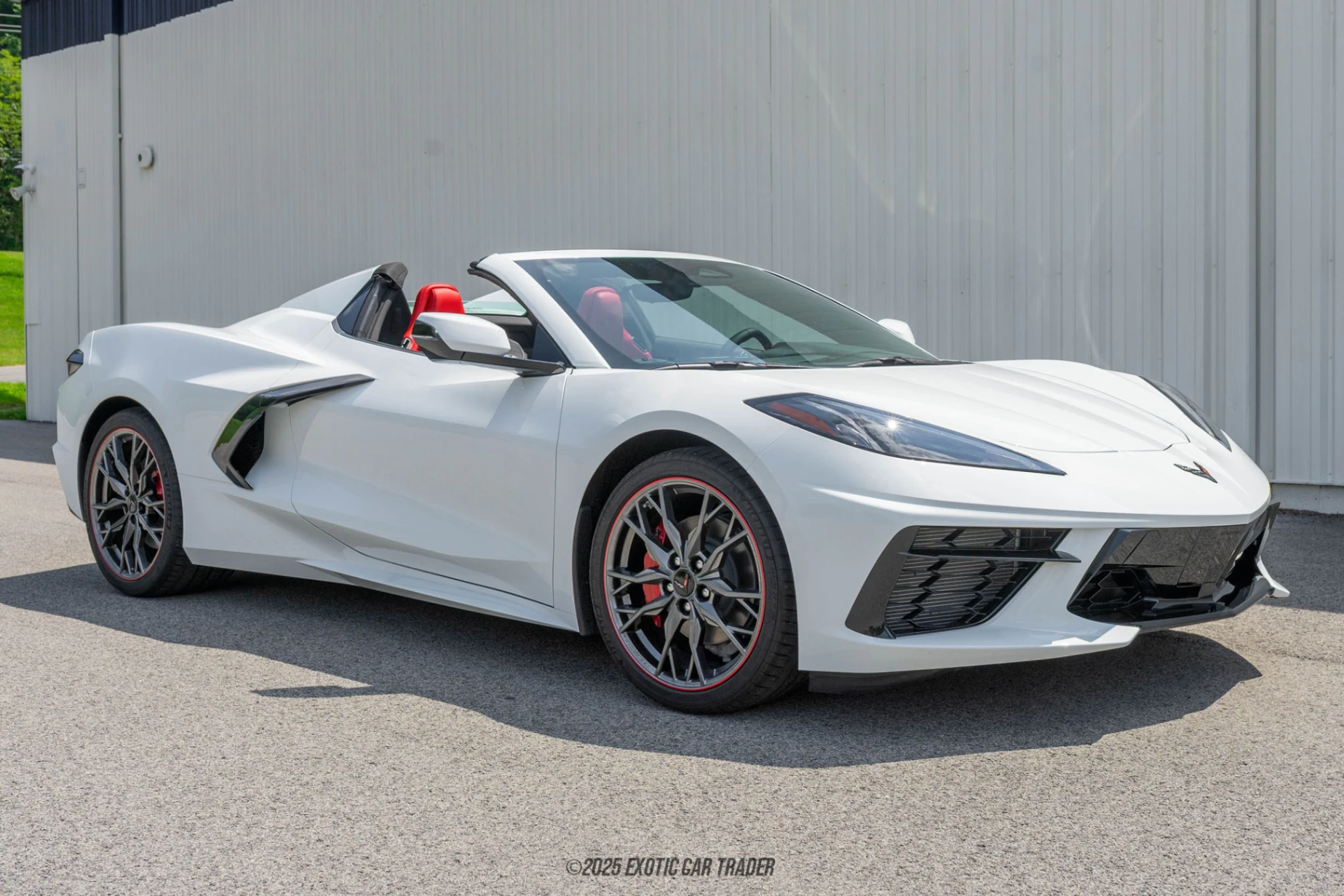 This Arctic White 2025 Chevrolet Corvette Stingray 1LT is of the convertible variant, which means it’s got a power-retractable hardtop. That’s wonderful because you’re getting a fixed-head coupe and a swish convertible all wrapped up in one car. The car rides on a nice set of 20-spoke Midnight Gray forged aluminum wheels with a red lip stripe. Behind these wheels lie Edge Red-painted brake calipers for the car’s high-performance braking system. You can even remotely activate the engine to scare onlookers without getting inside, although the more practical purpose of this feature is to pre-heat or pre-cool the interior before you enter it. The interior of this 2025 Chevrolet Corvette Stingray 1LT comes in striking Edge Red. It seats two adults on 8-way power-adjustable GT bucket seats. You’ve got a digital gauge cluster, Apple CarPlay, Android Auto, and a heads-up display. Dual-zone automatic climate control with air conditioning keeps occupants comfortable, while the 10-speaker Bose sound system provides ample serenading abilities. Or, you could switch it all off, retract the hardtop, drop down a gear via a steering wheel-mounted paddle, and let the LT2 V8 sing its song.