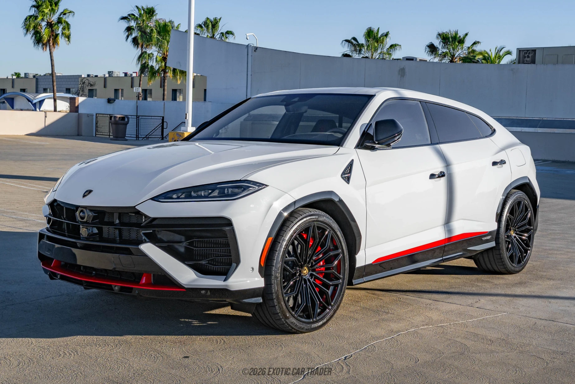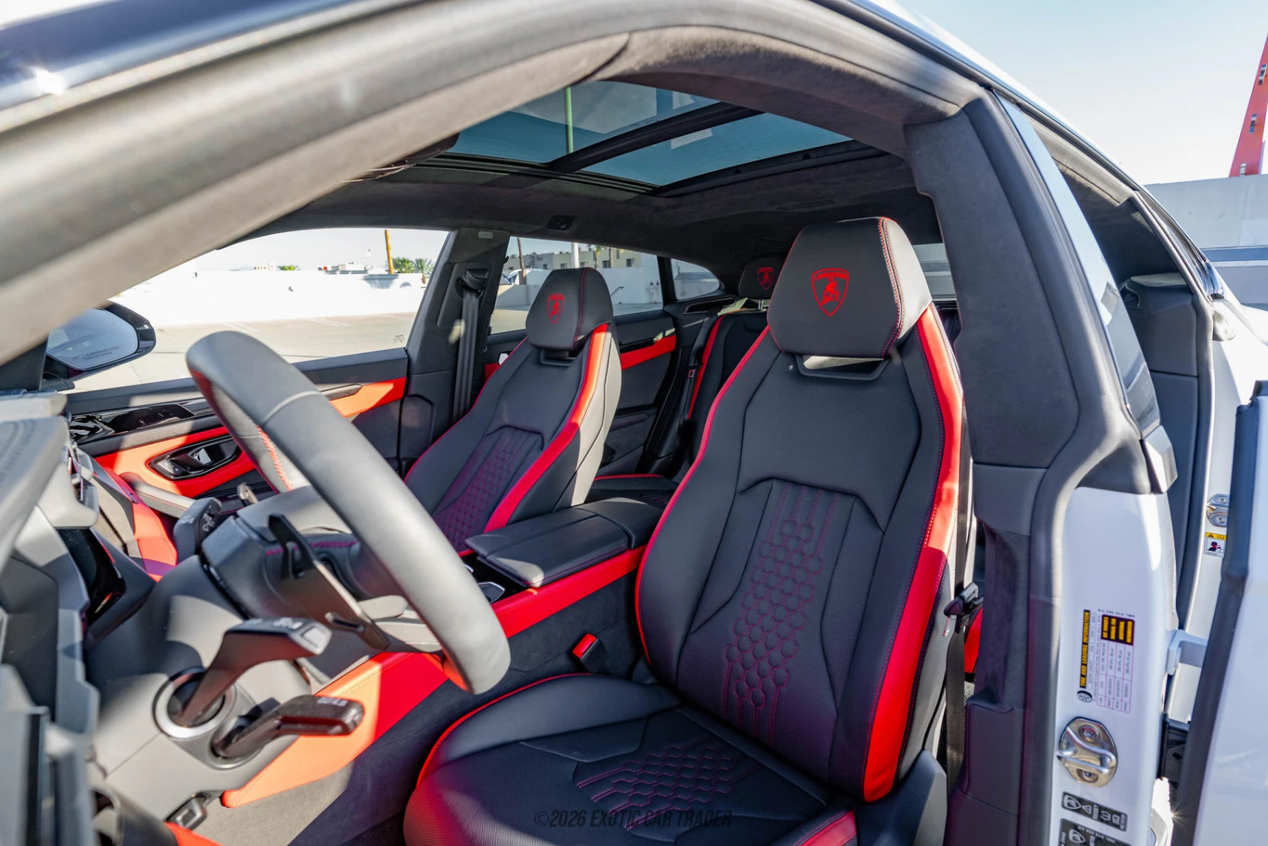 The exterior of this 2025 Lamborghini Urus SE is finished in Bianco Monocerus, a crisp and sophisticated white that highlights the SUV’s sharp, angular body lines. This example is further enhanced by the Full High Gloss Black Style Package, which adds contrast through elements such as the rear spoiler, mirror housings, and exterior trim. Sitting on 23-inch Galanthus wheels in shiny black and paired with red brake calipers, the stance is both aggressive and refined. Additional touches like black matte exhaust tailpipes and Lamborghini logo door lights elevate the overall presence, giving this Urus SE a stealthy yet high-performance aesthetic. The interior of this 2025 Lamborghini Urus SE is appointed in a Nero Ade and Rosso Mars bicolor leather configuration, offering a dramatic contrast that reflects Lamborghini’s signature design language. Perforated leather seats, embroidered Lamborghini shields, and contrast stitching enhance the premium feel, while the Interior Dark Package adds a more focused, driver-centric ambiance. The cabin is also equipped with a panoramic roof and ambient lighting, creating a more open and customizable environment. Technology is a standout here, with the Advanced 3D Bang & Olufsen sound system delivering an immersive audio experience, alongside Lamborghini’s dual touchscreen interface for vehicle and infotainment controls.